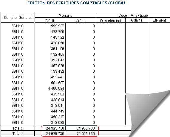 Après le calcul de la paie du mois, générer et s'assurer que le journal des écritures comptables est equilibré. Pour Générer les écritures comptables dans FlexCube... Dans Edition>Journal comptable/Interfaces>Interface FlexCube >OK 1.Saisir les critères suivants •le Mois et Année (ex: 12..../...2012) •le N°Employés Du……0…/Au……zzzz/ •Utiliser le compte de provision (ex : N) 2.Cliquer sur Générer. 3.Pour imprimer le journal, cliquer sur Options > Recap... Exemple d'un journal des écritures comptables imprimé pour FlexCube