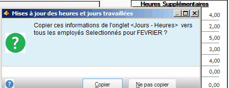 | Copier les heures supplémentaires chez un autre employé (Paie> Heurs et Jours travaillés) |